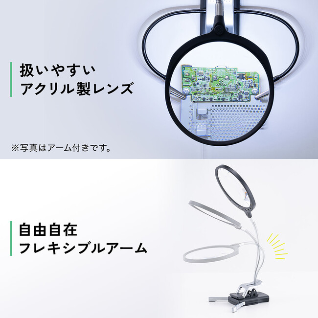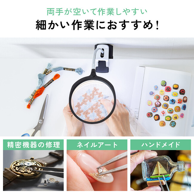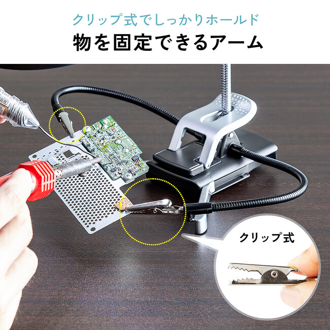 400-LPE021(アーム付き)は、クリップアームを搭載し手芸やプラモデルのパーツを挟んで固定することができます。