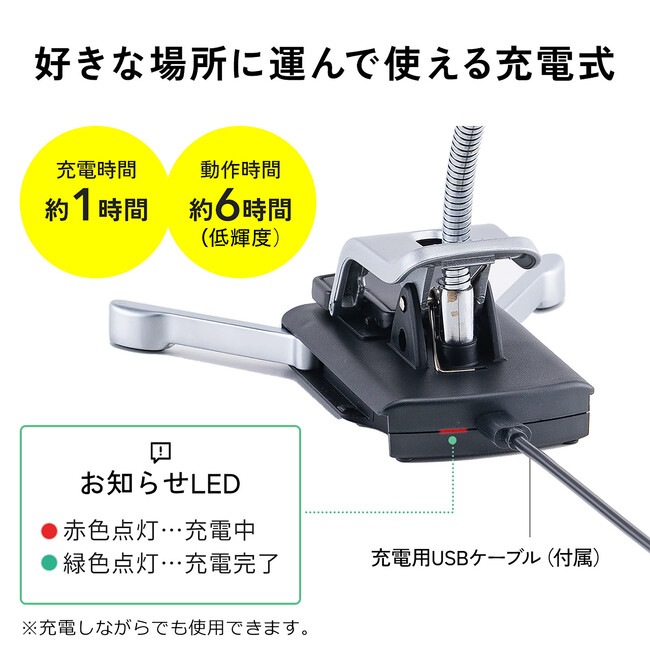 好きな場所で使用でき、場所を選ばない充電電池を内蔵。一度の充電で最大6時間連続使用が可能です。