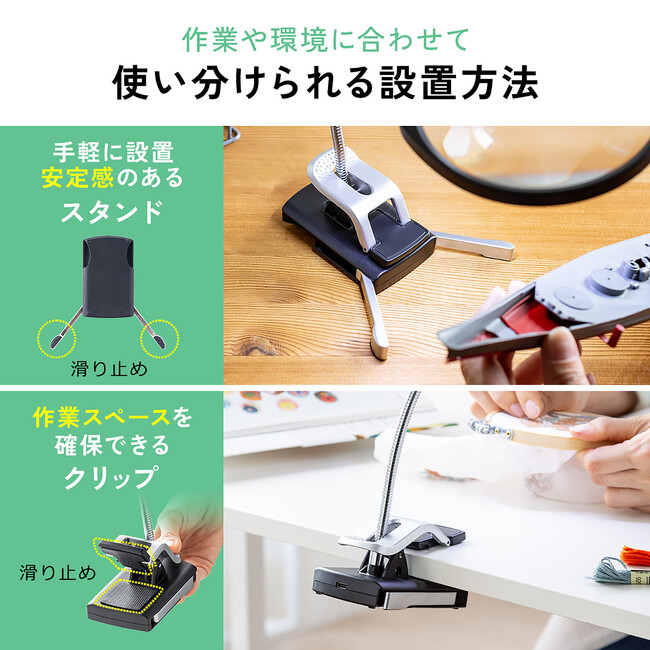 自立できるスタンドタイプで、両手が空くので作業しやすく細かい作業におすすめです。