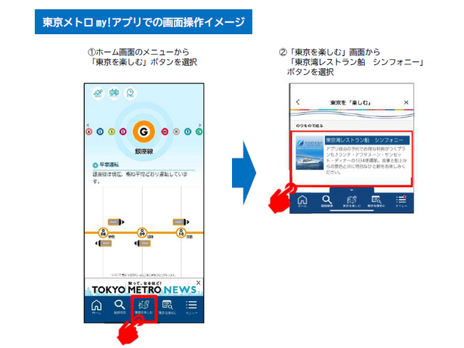 4 ご予約・ご利用の特典両社局の公式アプリを介して、予約用Webサイトから「クーポンコード」を入力のうえ予約したシンフォニークルーズをご利用いただいた方に、「ドリンク1杯」をプレゼントします。※ドリンクは、シンフォニー赤ワイン・白ワイン・オレンジジュース・ウーロン茶の中から選択できます。※ビア&カクテルプラン/恋人の聖地カップルプラン/クリスマスプラン及び乗船のみプランは特典対象外となります。5 両社局の公式アプリについて(1)アプリ利用料金無 料(通信料はお客様ご負担となります。)(2)対応機種・OS・iPhone: iOS 12.0以降・Android: Android OS 6.0以降(3)利用方法(ダウンロード方法)・東京メトロmy!アプリ:特設サイトよりダウンロード可能( https://www.tokyometro.jp/mobiledevice/smartphone/my )・都営交通アプリ:東京都交通局HPよりダウンロード可能( https://www.kotsu.metro.tokyo.jp/pickup_information/app.html )6 お問い合わせ先東京メトロお客様センター https://ssl.tokyometro.jp/support/inquiry01_jp都営交通お客様センター TEL: 03-3816-5700 (9:00〜20:00/年中無休)