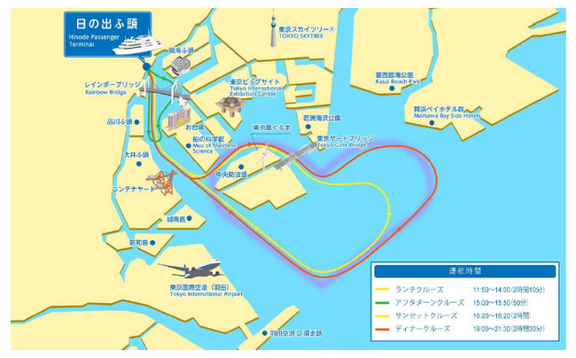 3 ご予約が可能なコース両社局の公式アプリからリンクするシンフォニークルーズの予約用Webサイトで申し込みができる全てのコース(団体個室貸切、ウエディングを除く)が対象となります。※同Webサイトに表示される「クーポンコード」を入力のうえ、お申し込みください。※予約の際は、必ず公式HP( https://www.symphony-cruise.co.jp/ )から各コースの最新の情報をご確認ください。< 特 徴 >レインボーブリッジと東京ゲートブリッジの2つの橋を通過するシンフォニーオリジナルコースで船上からでしか味わえない景色をお楽しみいただけます。※アフタヌーンクルーズは「レインボーブリッジ」のみを通過します。<主なコースのご案内>ランチクルーズ(11:50〜14:00)船内厨房で仕上げたフレンチ・イタリアンをお召し上がりいただきながら、爽やかな潮風とともにパノラマの景色をご覧いただけます。アフタヌーンクルーズ(15:00〜15:50)気分転換や船が初めての方にも気軽に楽しめるケーキセット付きのショートクル ーズです。サンセットクルーズ(16:20〜18:20)季節によって夕焼けから夜景に移り行く幻想的な景色を眺められる人気のクルー ズです。ディナークルーズ(19:00〜21:30)煌めく夜景に包まれながらロマンティックな時間をご堪能ください。特別な日に極上フレンチを楽しみたい方におすすめです。<主なコースの運航時間・航路図>航路図の中央のハート型の航路を「シンフォニーのハートライン」といいます。