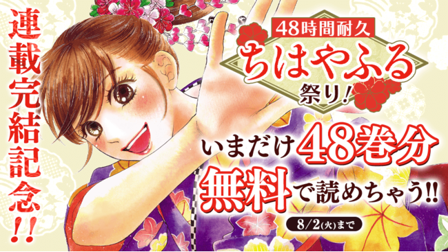 これを記念して、2022年8月1日(月)より漫画アプリ「マガポケ」にて『ちはやふる』コミックス48巻までを48時間限定で無料公開いたします! 48巻まで読んだ方はそのまま発売中の49巻を買っていただき、さらに8月1日発売の「BE・LOVE」本誌を読めば感動のフィナーレです! 『ちはやふる』の最後をみんなで一緒にお祝いしましょう!