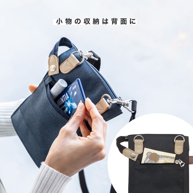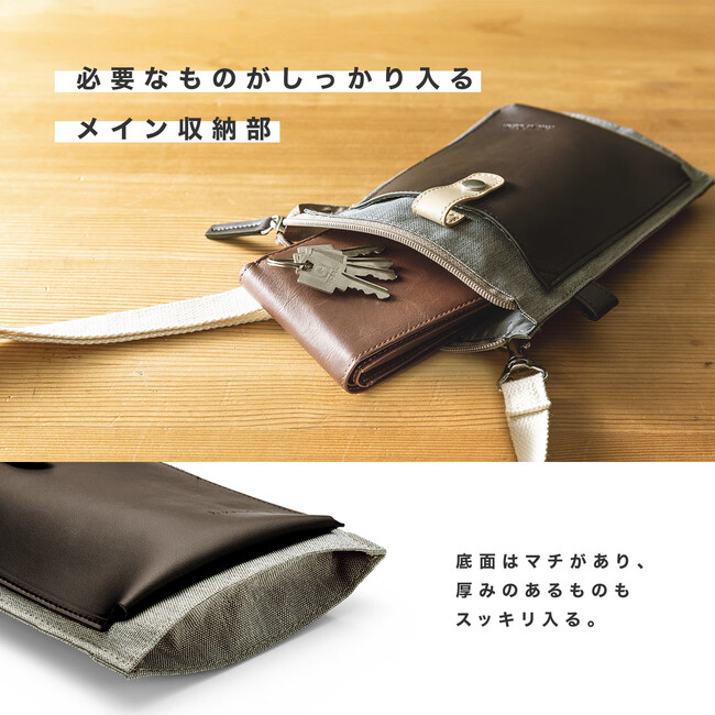 メイン収納部は、ファスナー付きで安心して貴重品を持ち運ぶことができ、底面はマチがあり、スッキリ収納できます。