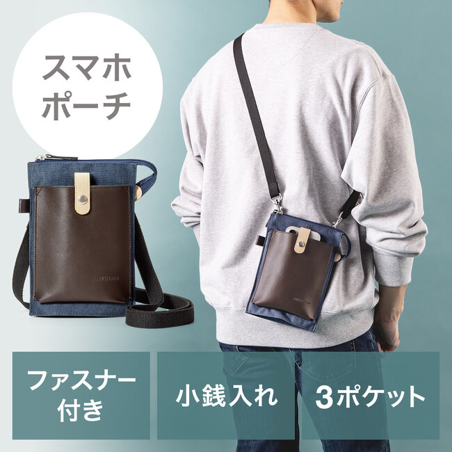 本製品は、カジュアルなデザインで身軽に使えるスマホポーチです。