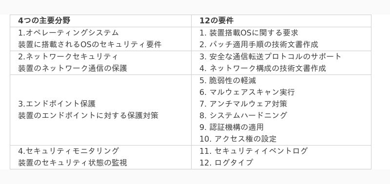 「SEMI E187」は、以下の4つの主要分野と12の要件で構成されています。GMOサイバーセキュリティ byイエラエでは、各要件に対して、実際の認証評価に準じたレベルで文書証跡の確認や技術的な評価を行い、認証取得を支援します。