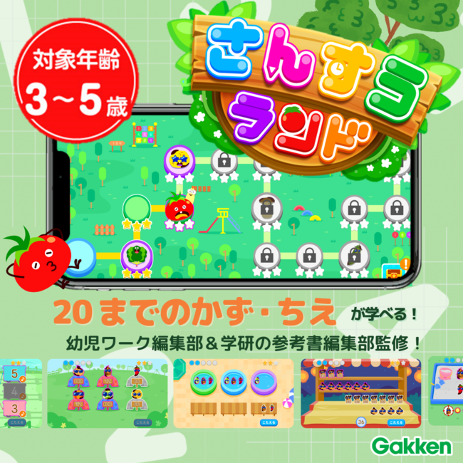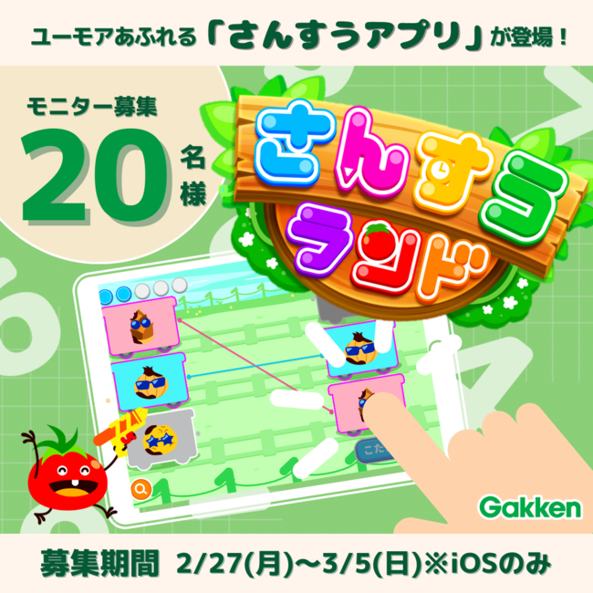 株式会社 学研ホールディングス(東京・品川/代表取締役社長:宮原博昭)のグループ会社、株式会社 Gakken(東京・品川/代表取締役社長:五郎丸徹)が運営する、3〜5歳向けの「かず」と「さんすう」が学べる知育アプリ『さんすうランド 20までのかず・ちえ 学研の知育ゲームアプリ』は、iOSアプリの公開開始にあわせ、2023年2月27日(月)よりモニターを20名募集開始しました。モニターの募集締め切りは3月5日(日)となります。