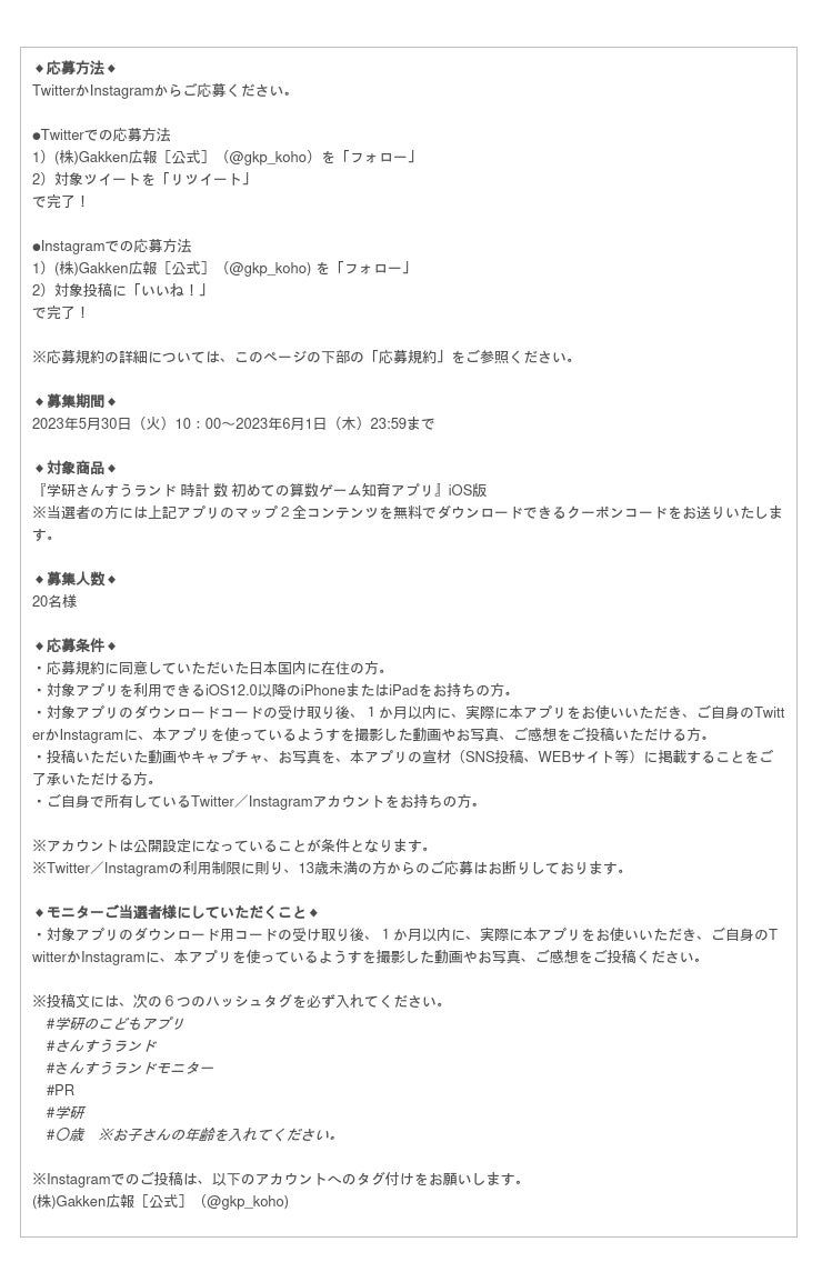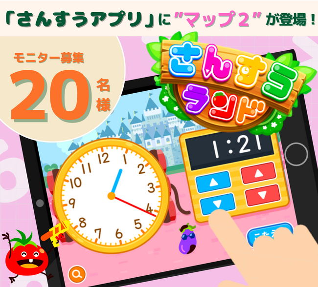 株式会社 Gakkenでは、6月上旬公開予定の知育アプリ『学研さんすうランド 時計 数 初めての算数ゲーム知育アプリ』(無料、アプリ内課金あり)のマップ2全コンテンツを無料でお試しいただき、実際に本アプリを利用している「写真や動画」「ご感想」をご自身のTwitterかInstagramに投稿くださるモニター様を募集いたします。