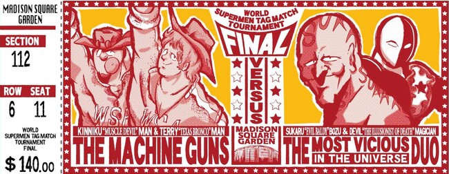 2枚目は通なファンに評価が非常に高い「アメリカ遠征編」からザ・マシンガンズ対宇宙一凶悪コンビの世界超人タッグ選手権の決勝戦チケット! 1980年代のプロレスのチケットやポスターのエッセンスと雰囲気を取り込んだデザイン性が光ります!