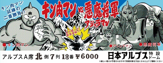 前回に続いて、デザインはヨシムラ氏が担当。1枚目は、正義超人でただ一人となったキン肉マンがアシュラマンと悪魔将軍に挑んだ「黄金のマスク」編の最終戦。日本アルプスに急遽設営された会場ながら、観客を慮ったチケット右下の注意喚起がニクイ!