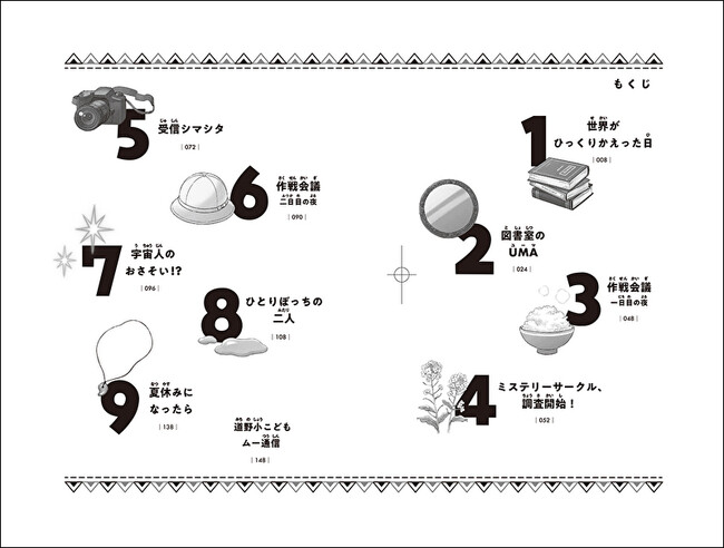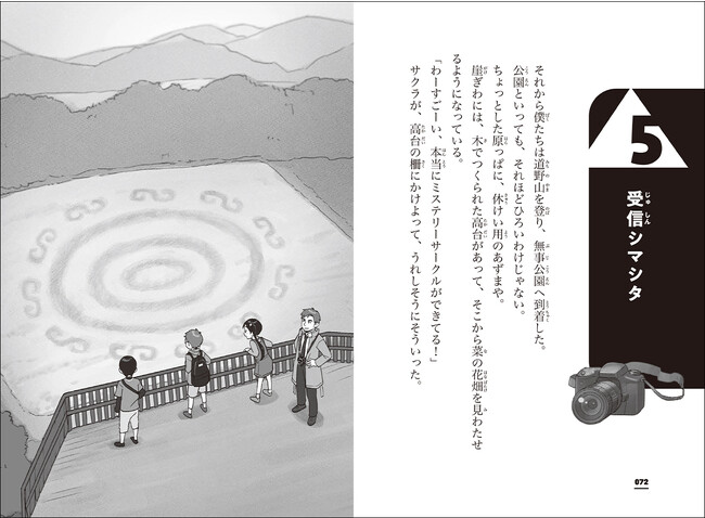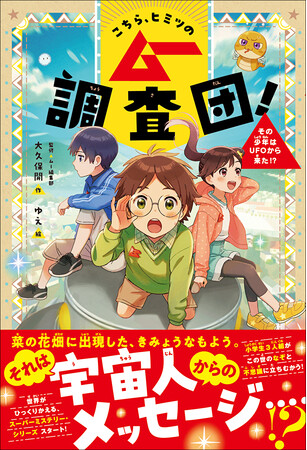 3人の小学生が、UFOや超能力、UMA(未確認生物)など、世界がひっくりかえるような不思議な事件の調査にいどむ本シリーズ。第1巻となる『こちら、ヒミツのムー調査団! その少年はUFOから来た!?』では、ツチノコやケサランパサランといったUMAとともに、山のふもとに出現したミステリーサークルを調査するストーリーです。