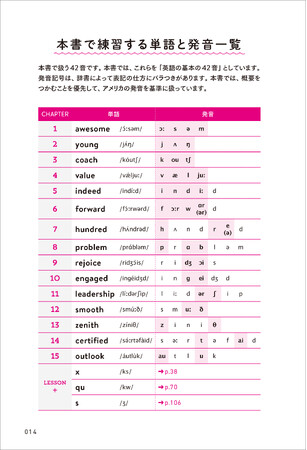 最短ルートの発音習得術!よく使う簡単な英単語を15語ピックアップ。わずか15語の単語で英語の基本の発音42音がマスターでき、驚くほど発音がよくなるだけでなく役立つフレーズも練習できる、一石二鳥の1冊!
