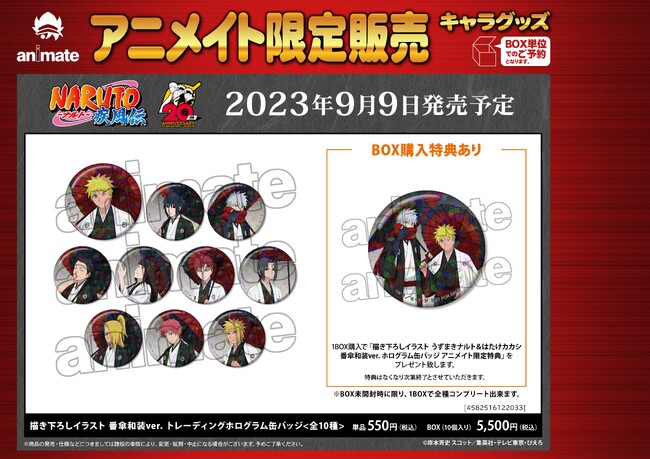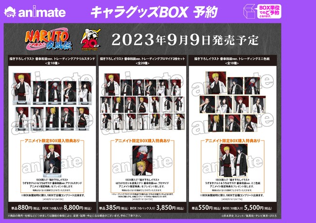 ※9月9日(土)より予約開始予定のECサイト「AMNIBUS」では、BOX購入特典として「描き下ろしイラスト うずまきナルト&はたけカカシ 番傘和装ver. アクリルカード AMNIBUS限定特典」を予定しております。
