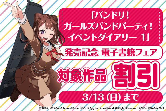 株式会社ブシロード(本社:東京都中野区、代表取締役社長:橋本義賢、以下ブシロード)のグループ会社にあたる株式会社ブシロードメディア(本社:東京都中野区、代表取締役社長:成田耕祐)は、本日2月28日(月)より『「バンドリ! ガールズバンドパーティ! イベントダイアリー 1」発売記念電子書籍フェア』が各電子書店にて開始したことをご案内致します。本日「バンドリ! ガールズバンドパーティ! イベントダイアリー」単行本第1巻が発売されたことを記念しまして、ブシロードメディア発行の「BanG Dream!」に関連したコミックス作品がお得に読めるフェアを開催致します。皆様におかれましては是非誌面・Web記事等で本内容をお取り扱いいただければ幸いに存じます。