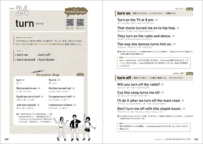 本書では、日本人が苦手とする英語の発音や、英会話で頻出する25個の基本動詞(break, get, takeなどの基本的な動詞)を使用した例文を「ラップ」することで身につけます。声に出して練習する例文は700以上。楽しく発声するうちに、音読学習の理想的な質と量を確保できてしまいます。ラップにはカタカナで参考となる発音も記載しているので、英語を見るだけではラップするのが難しいという人も安心して取り組めます。