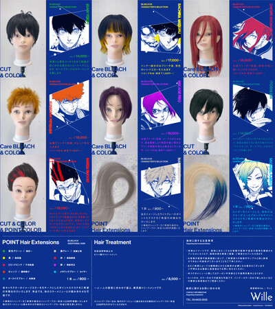 本コラボ期間中、「Wille」ではコラボメニューとしてブルーロックの人気キャラクターをイメージしたヘアスタイルやポイントエクステなどの施術メニューをご提供します。