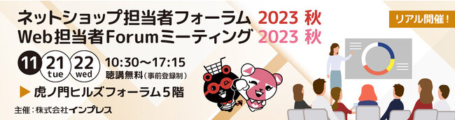 インプレスグループでIT関連メディア事業を展開する株式会社インプレス(本社:東京都千代田区、代表取締役社長:高橋隆志)は、全50講演以上の無料セミナーイベント「ネットショップ担当者フォーラム 2023 秋」「Web担当者Forum ミーティング2023 秋」を、2023年11月21日(火)〜22日(水)の2日間にわたり、東京・虎ノ門ヒルズフォーラムで同時開催いたします。