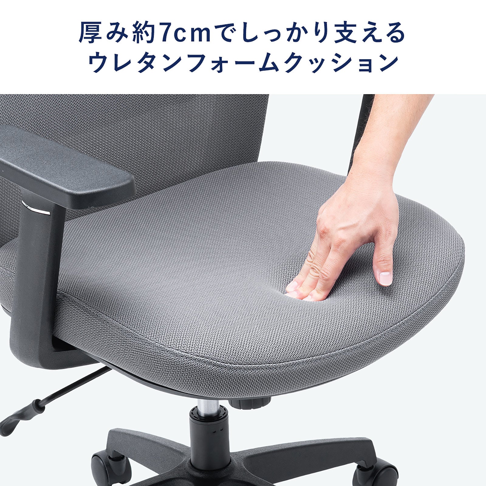 座面には柔らかいウレタンクッションを採用し、座り直しの頻度を軽減。さらにナイロン製キャスターがスムーズな移動を実現します。機能性と快適性を兼ね備えた仕様で、日常のオフィスワークをサポートします。