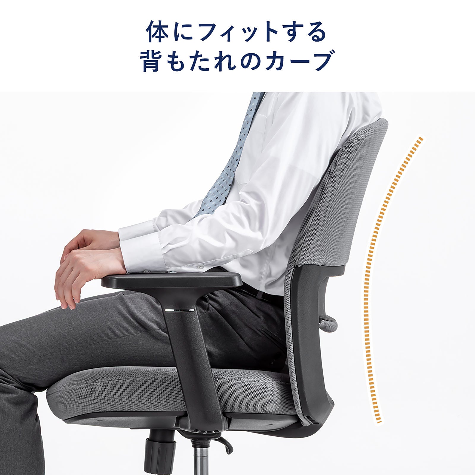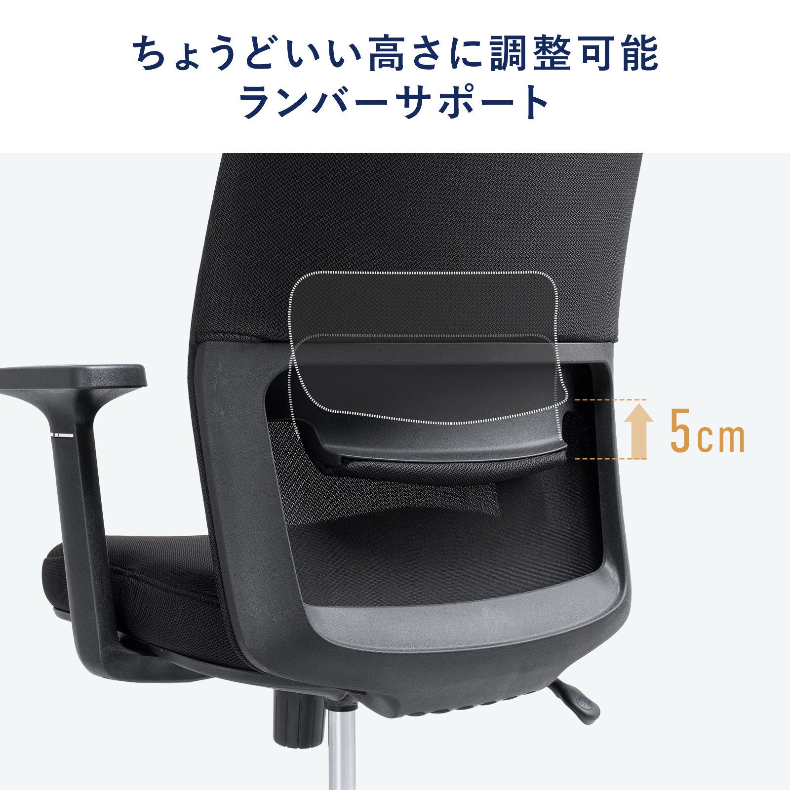 背もたれには上下に調節可能なランバーサポートを内蔵。腰への負担を軽減し、自然なS字カーブを保ちながら理想的な姿勢をサポートします。快適性と健康面の両立を叶えることで、長時間のデスクワークを支える頼れる存在です。