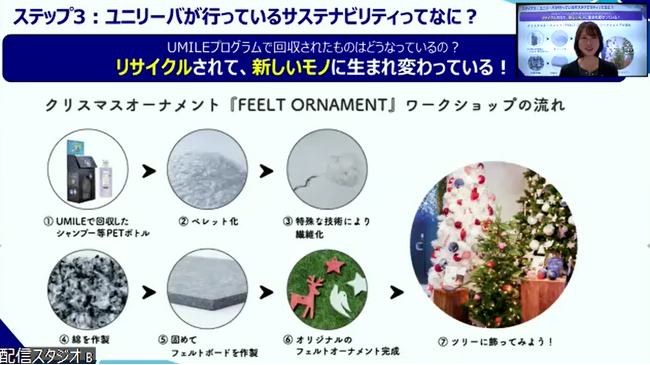 参加児童には、ユニリーバのUMILE(ユーマイル)プログラムの取り組み事例から資源循環について学ぶ15分ほどの動画を見ていただきます。ワークシートに学んだことを書き込み、その後、参加者やファシリテーターとともに、自分の身の回りの資源循環について考えて発表します。最後に、シャンプー等使用済プラスチック空容器の回収・再生した素材から、クリスマスオーナメントを作るワークショップを行い、楽しみながら学びます。