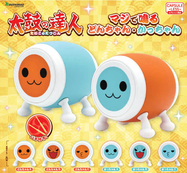 楽曲のリズムにあわせて和太鼓を叩いて遊ぶリズムゲーム『太鼓の達人』より、「どんちゃん」と「かっちゃん」がかわいいフィギュアになってカプセルトイで登場だドン!