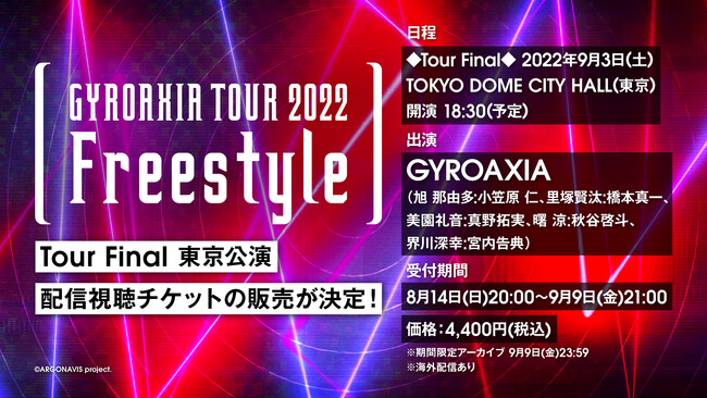 アニメ、ゲーム、声優によるリアルライブ等、様々なメディアミックスを展開する「from ARGONAVIS」より2022年9月3日(土)TOKYO DOME CITY HALLにて【GYROAXIA TOUR 2022 -Freestyle- Tour Final】を開催。