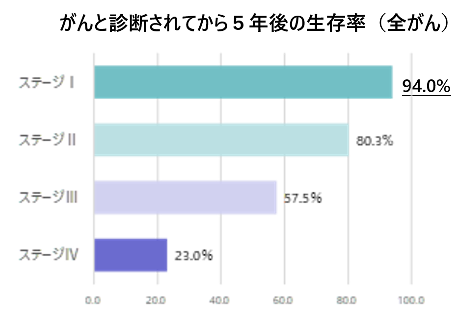 がんの早期発見・早期治療による5年後の生存率は90%以上です。