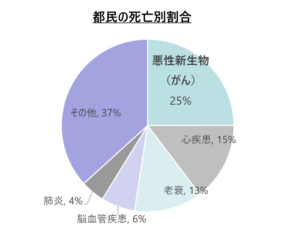 日本人の2人に1人が生涯のうちにがんになると言われており、誰でもがんになる可能性があります。また、令和5年にがんが原因で亡くなった都民は34,276人で、死因の約4分の1を占めます。