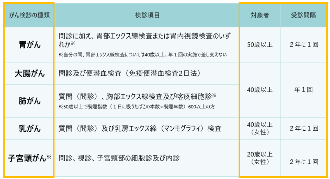 がんによる死亡率の減少効果が科学的に証明されているがん検診として、国は以下の5つのがん検診について、検診項目、対象者、受診間隔等を指針で定めて受診を推奨しています。
