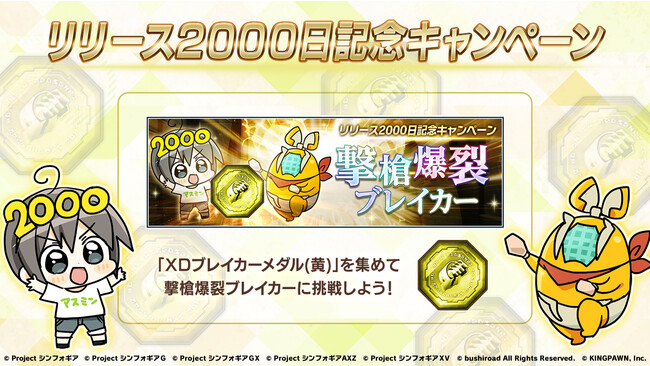 同期間に開催されるリリース2000日記念ログインボーナスやミッションで獲得できる「XDブレイカーメダル(黄)」を使用して、専用の撃槍爆裂ブレイカーを実行することができます。