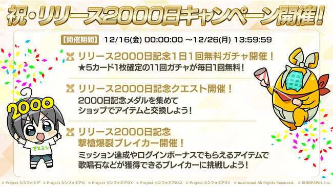 株式会社ブシロード(本社:東京都中野区、代表取締役社長:木谷高明)と株式会社キングポーン(本社:東京都中央区、代表取締役社長:清水祐一)は、好評配信中のスマートフォン向けゲームアプリ「戦姫絶唱シンフォギアXD UNLIMITED」にて、「リリース2000日キャンペーン」を2022年12月16日(金)00:00より、「バーサスイベントVer.翼[Another]&クリス[Another]」を2022年12月16日(金)17:00より配信開始したことをお知らせします。