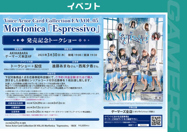 株式会社ブシロード(本社:東京都中野区、代表取締役社長:木谷高明)のグループ会社にあたる株式会社ブシロードクリエイティブ(本社:東京都中野区、代表取締役社長:成田耕祐)は、Voice Actor Card Collection(以下:ボイコレ) EX VOL.05 Morfonica『Espressivo(エスプレッシーヴォ)』を2023年2月27日(月)に発売することをご案内致します。