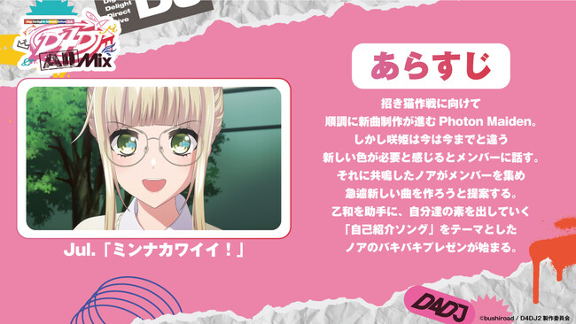株式会社ブシロード(本社:東京都中野区、代表取締役社長:木谷高明)は、2月24日(金)23時よりTOKYO MX、BS日テレほかにて放送のTVアニメ「D4DJ All Mix」第7話あらすじと先行場面カットの公開をしたことをご案内いたします。