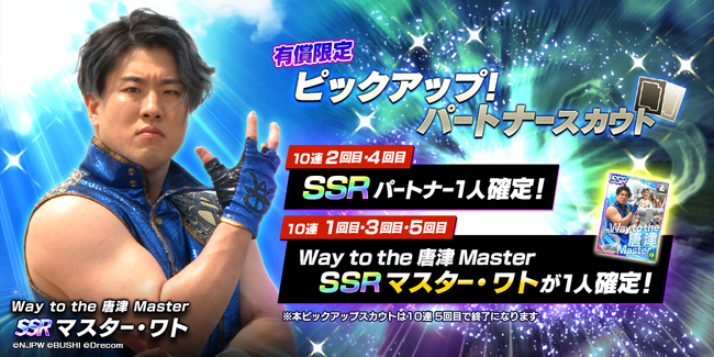 新日SSは2023年6月30日(金)9:00から、SSR「[Way to the 唐津 Master]マスター・ワト」が登場する「唐津限定!ピックアップ!パートナースカウト」を開催しました。本スカウトにて、10連スカウトを既定回数行うと、ラインナップに含まれるSSRパートナーからいずれか1人を確定で獲得できるステップアップ仕様となります。また、今回初登場するSSR「[Way to the 唐津 Master]マスター・ワト」は、ピックアップ対象として、スカウト確率が通常の5倍となっています。