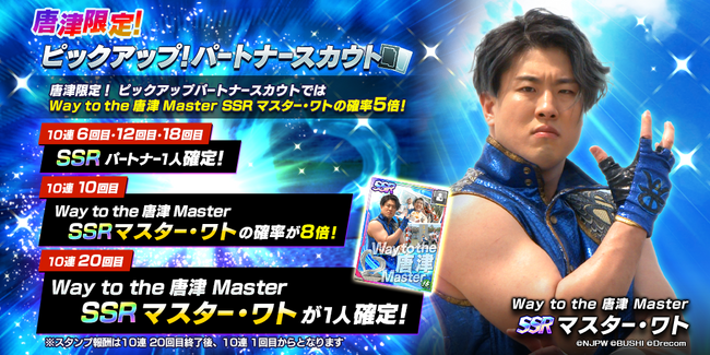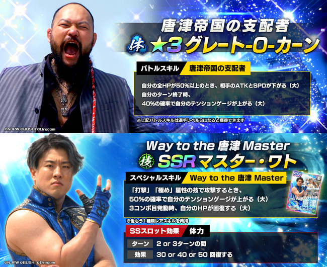 株式会社ブシロード(本社:東京都中野区、代表取締役社長:木谷高明)は、株式会社ドリコム(本社:東京都品川区、代表取締役社長:内藤 裕紀)と共同開発しているスマートフォンゲームアプリ『新日本プロレスSTRONG SPIRITS』(以下、新日SS)にて、2023年6月30日(金)9:00より、唐津市とのコラボレーション企画を実施致します。本コラボ限定で、★3選手「[唐津帝国の支配者]グレート-O-カーン」とSSRパートナー「[Way to the 唐津 Master]マスター・ワト」を実装致しました。観光名所や特産など、唐津の魅力を盛り込んだ撮りおろしの動画やスナップショットをお楽しみいただけます。