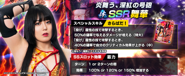 株式会社ブシロード(本社:東京都中野区、代表取締役社長:木谷高明)は、株式会社ドリコム(本社:東京都品川区、代表取締役社長:内藤 裕紀)と共同開発しているスマートフォンゲームアプリ『新日本プロレスSTRONG SPIRITS』(以下、新日SS)にて、2023年7月26日(水)メンテナンス終了後より、新規パートナーカードとして、STARDOMからSSR「[炎舞う、深紅の号砲]舞華」を実装致しました。また、実装を記念して、全ユーザー様にダイヤ1500個を配布しております。