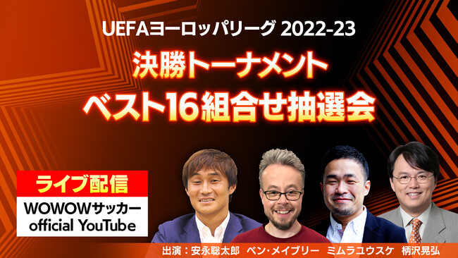 番組には、安永聡太郎、ベン・メイブリー、ミムラユウスケ、柄沢晃弘が出演。組合せ抽選会を実況しつつ、決定した注目の対戦カードについて展望していきます。今シーズンは、久保建英(レアル・ソシエダ)をはじめ冨安健洋(アーセナル)や堂安律(フライブルク)など多くの日本代表選手も出場しており、世界最高峰の戦いでどのような活躍を見せてくれるのかにも注目が集まります。本大会はもちろん、決勝トーナメント・ベスト16組合せ抽選会もあわせてお楽しみください!