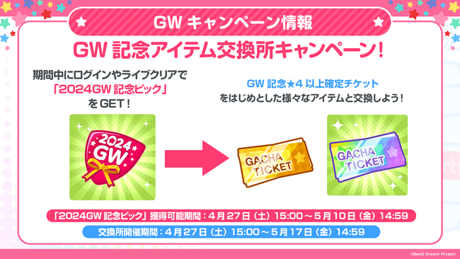 ログインやライブクリアで「2024GW記念ピック」を獲得することができ、集めた「2024GW記念ピック」を使って交換所で好きなアイテムと交換することができます。