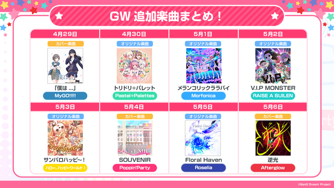 株式会社ブシロード(本社:東京都中野区 代表取締役社長:木谷高明、以下、ブシロード)は、2024年4月25日(木)に配信いたしました、「ガルパステーション #20」にて、スマートフォン向けゲーム「バンドリ! ガールズバンドパーティ!」(以下、ガルパ)のゴールデンウィークキャンペーン情報や、新規ゲーム内情報などを発表したことをお知らせします。