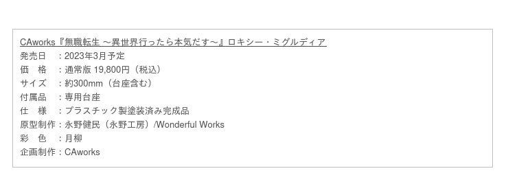 株式会社KADOKAWA(本社:東京都千代田区、代表取締役社長:夏野 剛 以下KADOKAWA)は、「ワクワクを超えたドキドキをお届け!」をコンセプトとしたフィギュアブランド「CAworks(シーエーワークス)」より、『無職転生 〜異世界行ったら本気だす〜』ロキシー・ミグルディア 1/7スケールフィギュアの再販売予約受付を開始しました。本アイテムはキャラアニ.comの他、全国のホビーショップ、ECストアで2022年11月9日(水)までご予約いただけます。