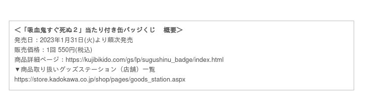 株式会社KADOKAWA(本社:東京都千代田区、代表取締役社長:夏野 剛 以下KADOKAWA)は、TVアニメ「吸血鬼すぐ死ぬ2」より、オンラインくじサービス「くじ引き堂」で過去に展開された描きおろしイラストを使用した「吸血鬼すぐ死ぬ2」当たり付き缶バッジくじを、全国書店で展開するキャラクター販売コーナー「グッズステーション」にて限定販売します。
