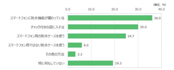 「防水機能が備わっている」36.0%、更に「防水ケース」や「チャック付きの袋」を併用する人も。 n=150