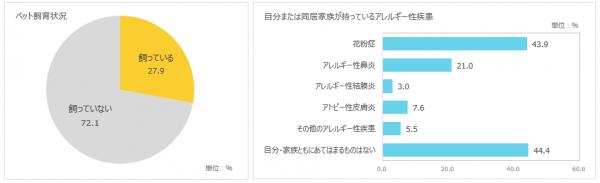 ペットを飼っていると答えた人は27.9%で3割弱。また、自分もしくは同居家族が持っているアレルギー性疾患としては、「花粉症」が43.9%で最も多く、「アレルギー性鼻炎」が21.0%、「アトピー性皮膚炎」が7.6%、「アレルギー性結膜炎」が3.0%となっている。「自分・家族ともにあてはまるものはない」と答えた人は44.4%で、何らかのアレルギー性疾患を持っている人がいる世帯は、全体の55.6%を占める結果となった。