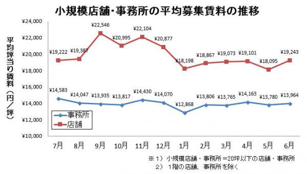 事務所と同様に、6月は、賃料高めの新規募集物件が多く出たため、募集中物件の平均賃料が上昇した形となっています。