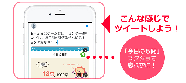 (3)Twitterハッシュタグ(#タゲ友夏キャン)を付けたツイートに、撮影したスクリーンショットを貼り付け、受験勉強への意気込み・決意コメントを入力して投稿する。