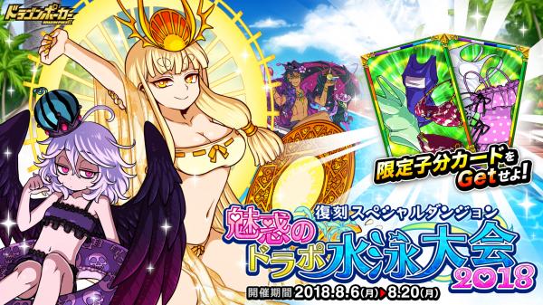 株式会社アソビズム(本社:東京都千代田区、代表取締役:大手智之)は、App Store・Google Playにて好評配信中のリアルタイム合体カードバトル『ドラゴンポーカー』で、2018年8月6日(月)より復刻スペシャルダンジョン「魅惑のドラポ水泳大会2018」を開催いたします。今回のダンジョンではさまざまなキャラクターたちが水着にお着替えし、モンスターとして登場します!夏限定のスペシャルダンジョンをお楽しみください!