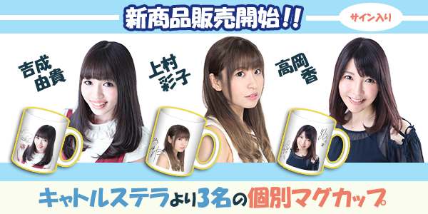 今回、カワセルで発売を開始する3名の声優グッズは全てカワセルでしか買えない限定グッズとなっています。記念すべき最初の声優カテゴリーの声優は、「キャトルステラ」より、「上村彩子」さん、「吉成由貴」さん、「高岡香」さんの3名。それぞれのマグカップの販売となります。本人たちのアーティスト写真に加え、本人のサインも組み合わせる形で商品化させていただきました。