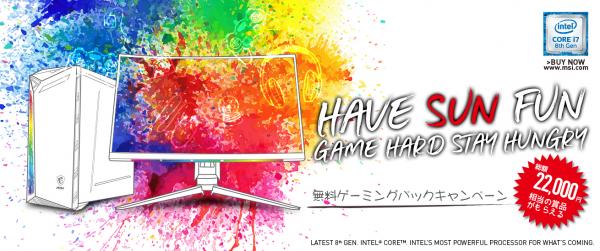 2018年8月20日 - Micro-Star International Co., Ltd. 台湾・新北市 - GAMING向けハードウェアの設計で世界をリードするMicro-Star International(MSI)は、8月21日〜10月31日の期間中、対象のMSI GAMINGデスクトップまたは湾曲型GAMINGモニターをご購入いただいた方に、バックパックやBluetoothスピーカーなどをプレゼントする「Have Sun Funキャンペーン」を実施いたします。