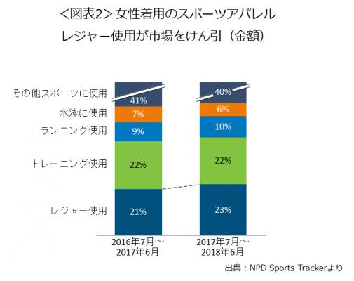 女性着用のスポーツアパレル使用目的※2を見てみると、最大のカテゴリーはカジュアル使用、いわゆるアスレジャー※3でシェアは23%です。直近1年計(2017年7月〜2018年6月)のシェアの伸びもプラス2ポイントとトップで、市場成長をけん引していることがわかります(図表2)。