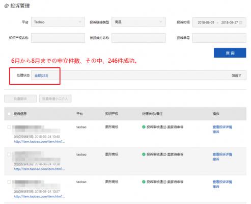 (2) 某店舗に対し、6月から2ヶ月を渡って、123件の侵害商品を申立てし、すべての商品が削除され、店舗が販売をとりやめました。