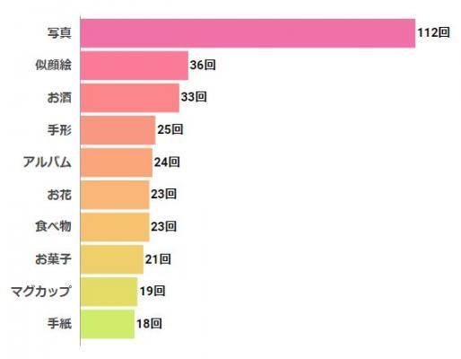 プレゼントに関する単語の出現頻度を多い順に、上位10個までをピックアップした。写真が圧倒的だが、それ以外にも似顔絵、手形、アルバムなど、お金のかからないもので、かつ子どもに関係するものが上位を占めている。やはり、「孫からの贈り物」とした方が喜ばれるのだと思われる。